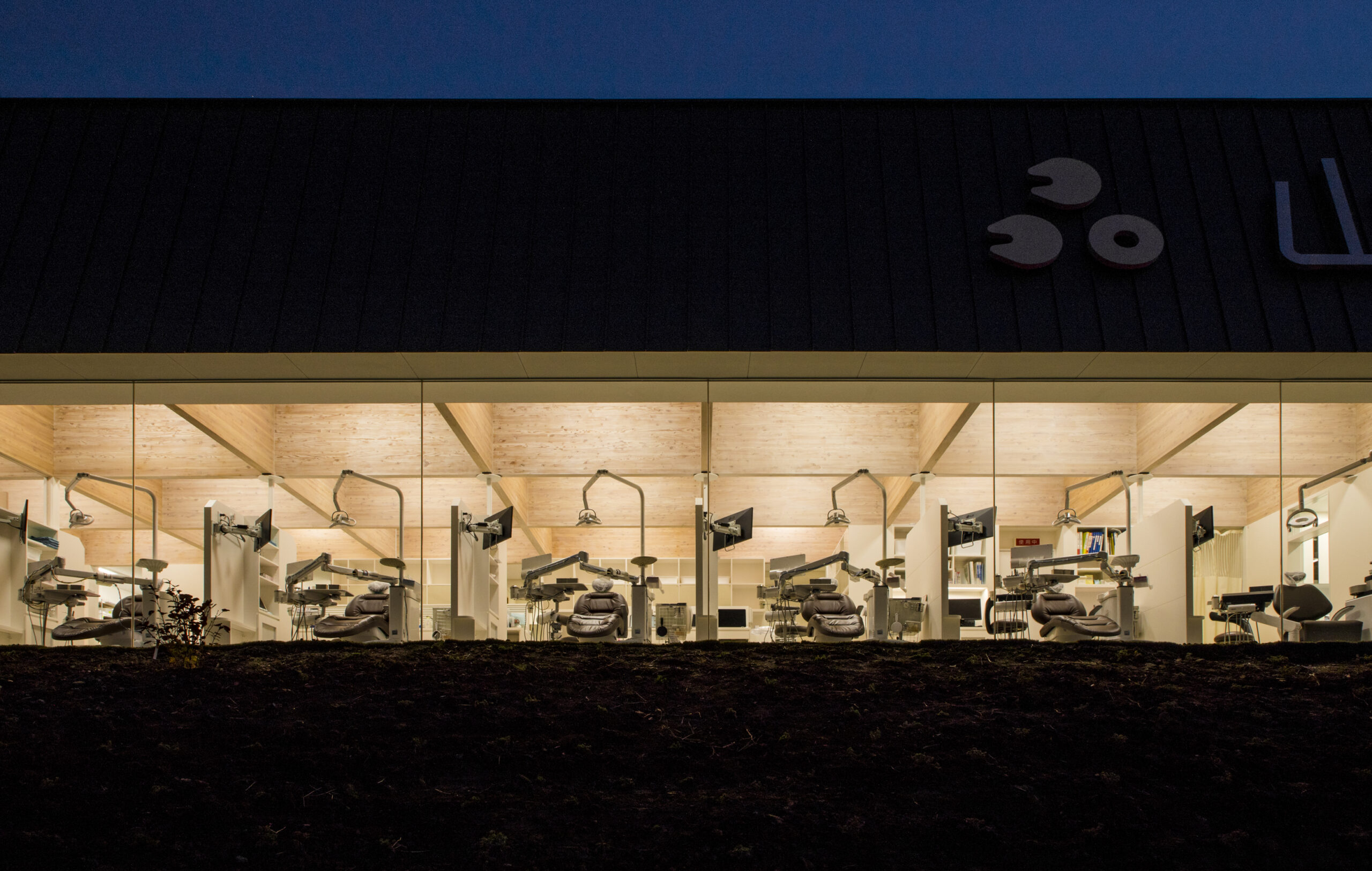 診察台からは、四季や時間とともに美しくうつろう景色を見下ろす「内」にいながらも「外」を感じられるよう、四季折々の草花が植えられた庭園と、その先の公園を望めるように幅27mの大開口を設けました。スタッフが移動しやすいオープンな空間と、患者が穏やかな感覚を感じることができる包まれた空間の相反する二面性の両立を図るため、厚み105mm、高さ1,150mmの集成材の梁を、「診察ユニット」を基準単位とした2.4m間隔で格子に組み、構造体がユニットを緩やかに隔て、「半個室」で木に包まれているような安心感の中で受診できる歯科医院としています。