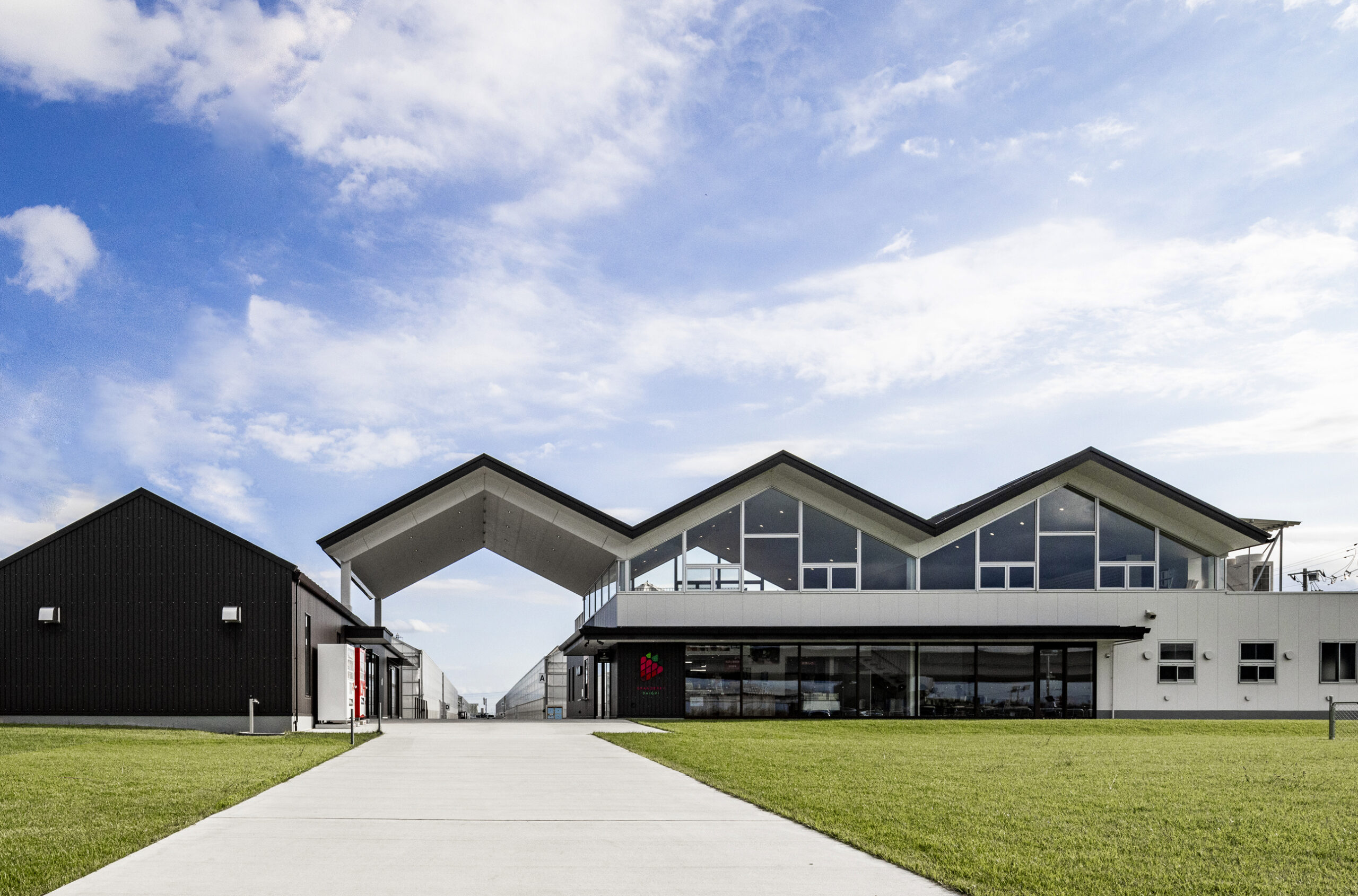 茨城の圏央道常総IC周辺地区において「食と農と健康の産業団地アグリサイエンスバレー事業」内の観光農園(空中いちご園)プロジェクトです。農園に連なる約19万本のいちごのビニルハウスを景観の一つと捉え、「ビニルハウス・カフェ・販売スペース・食品加工・駐車場」、そしてその中間を建築でつなぐ三角の大屋根「GRAN GATE」と「道」を計画しました。GRAN GATEが内外空間を結ぶ中間領域となることで、ここに訪れた観光客や地域の人々を迎えるハブとなります。ビニルハウスに吸い込まれるようにGATEをくぐると、ビニルハウスと空の風景が広がります。